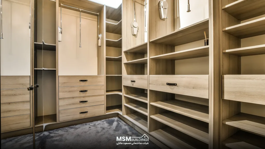 - استفاده از قفسههای باز: استفاده از قفسههای باز در کمد دیواری میتواند باعث ایجاد فضایی مدرن و مینیمال شود.